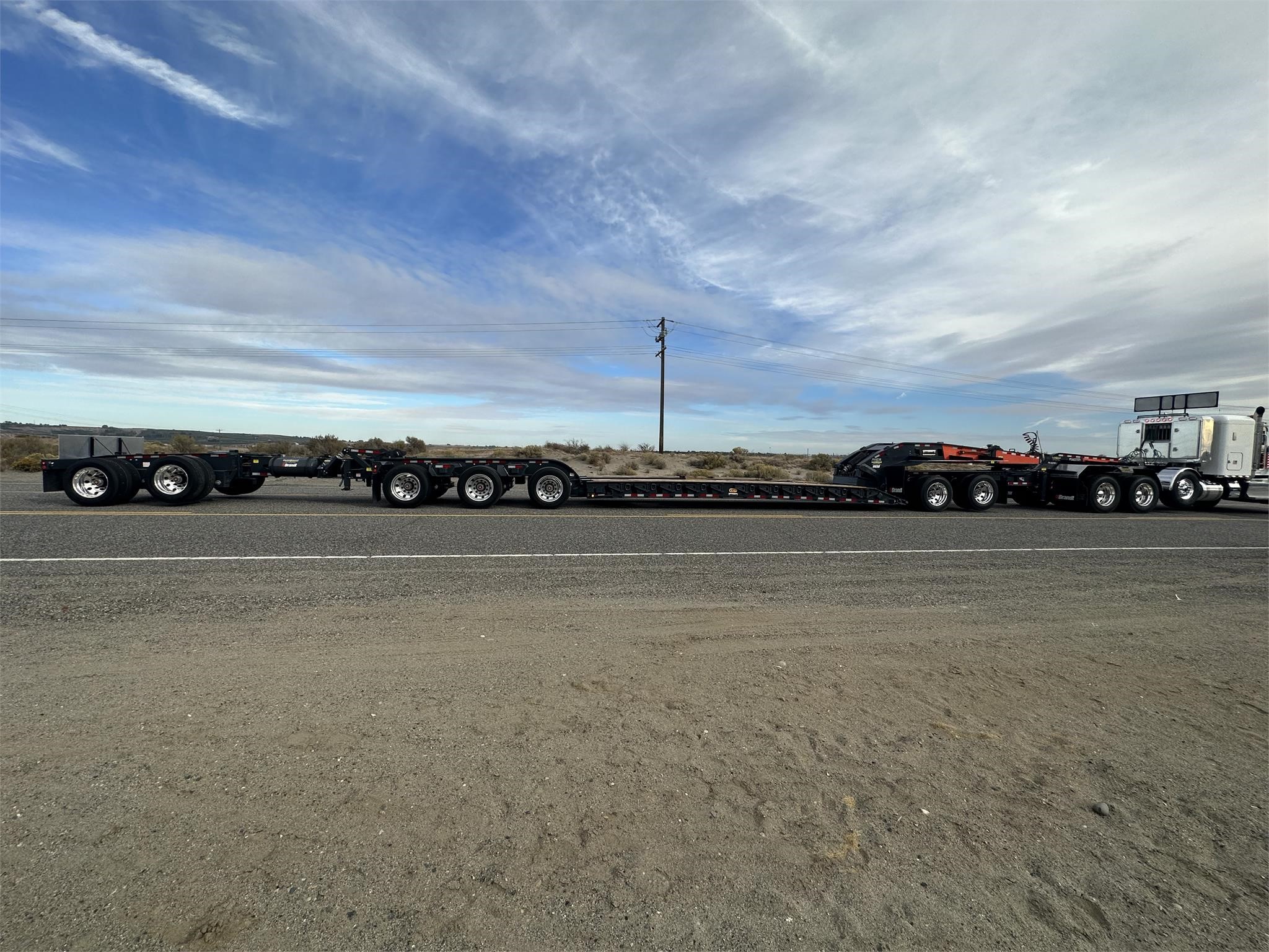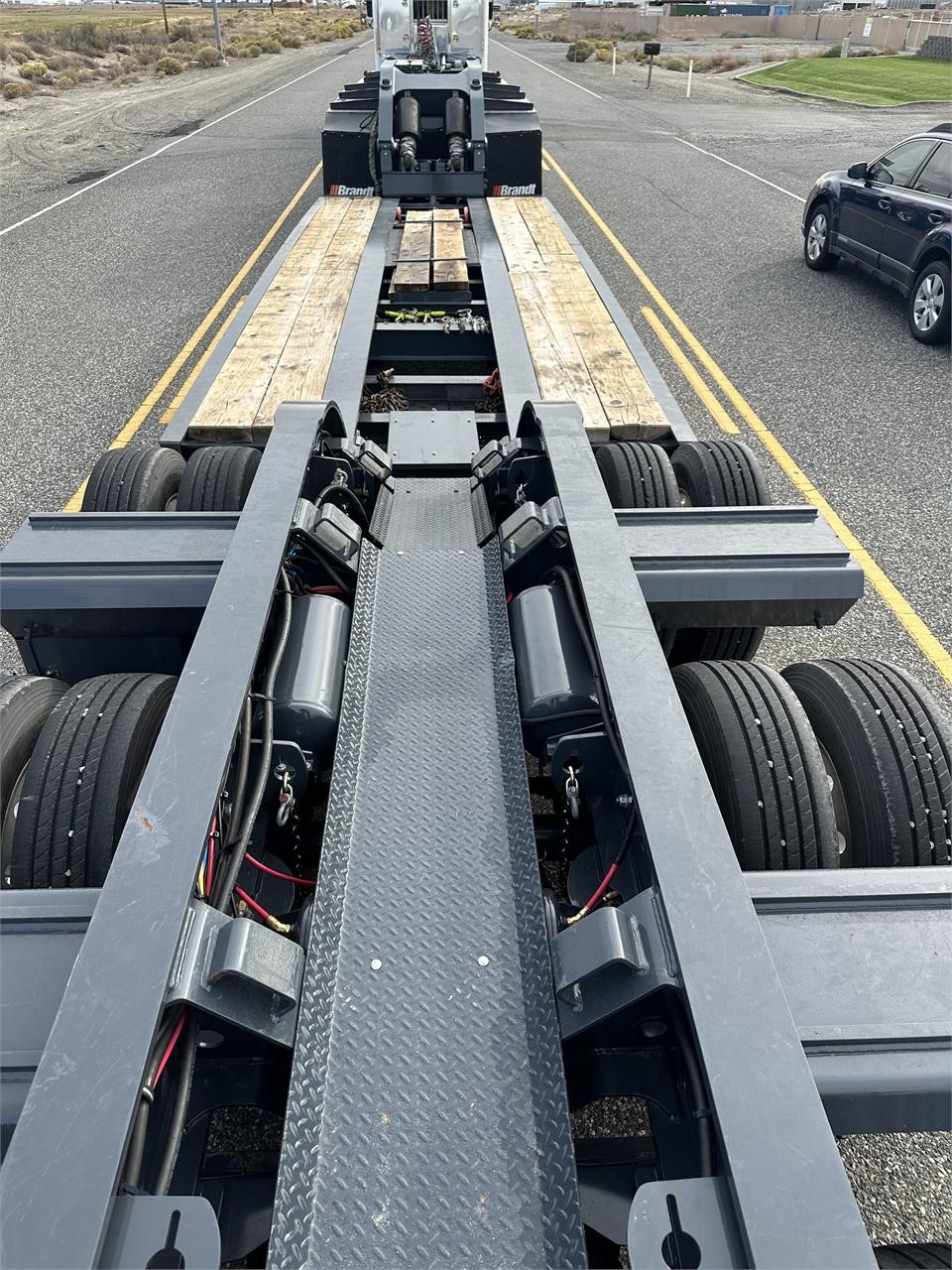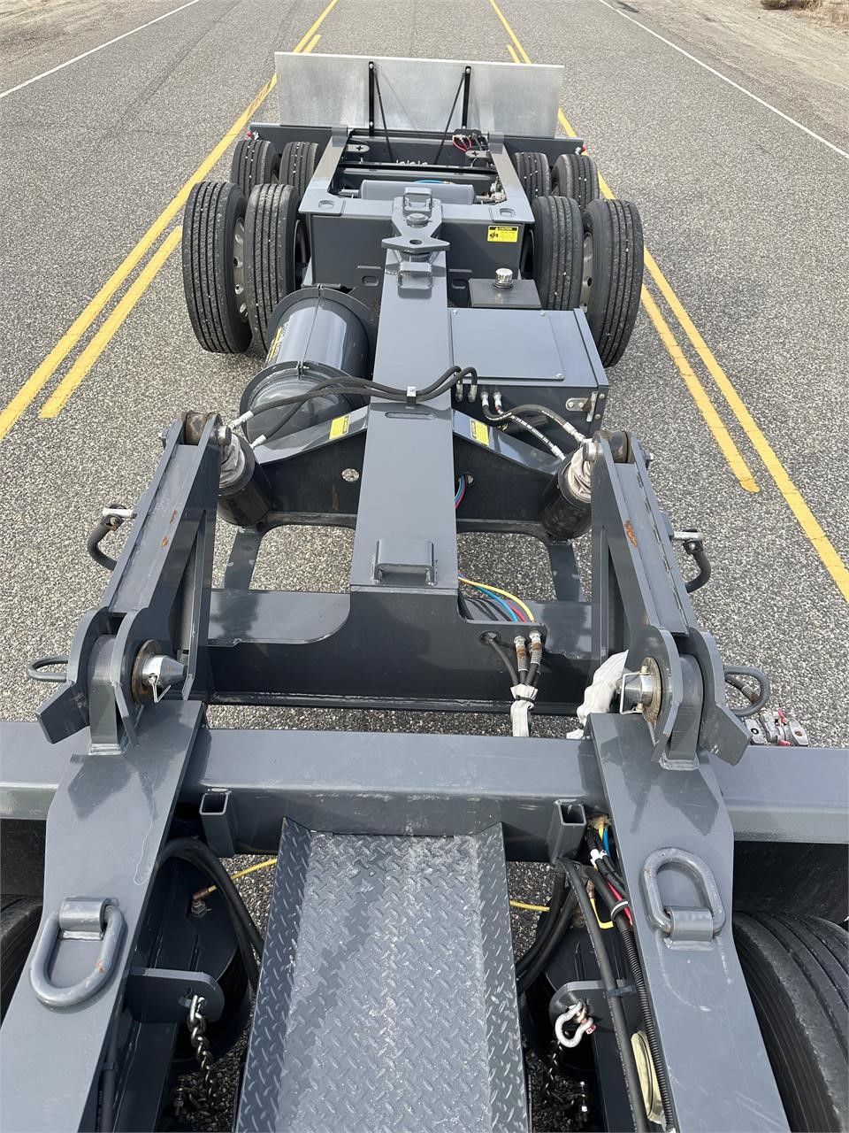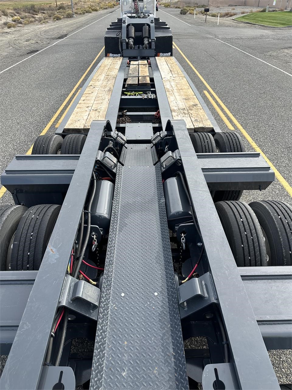 USED H650 65 ton RGN Lowboy, Flush Deck, 2+3+2 setup, 8’6″x24′ DRUM Brakes, Liftable 3rd Axle, – Gray