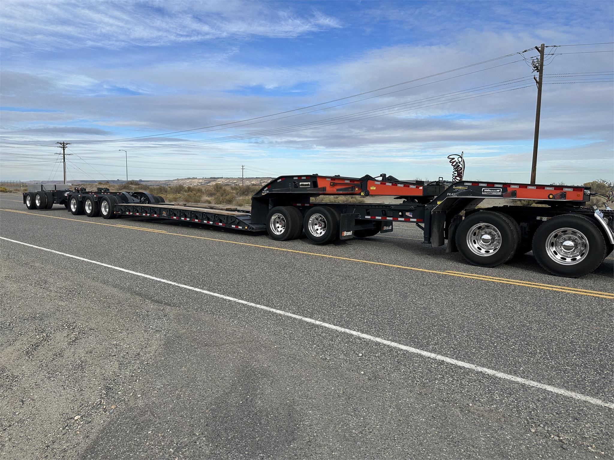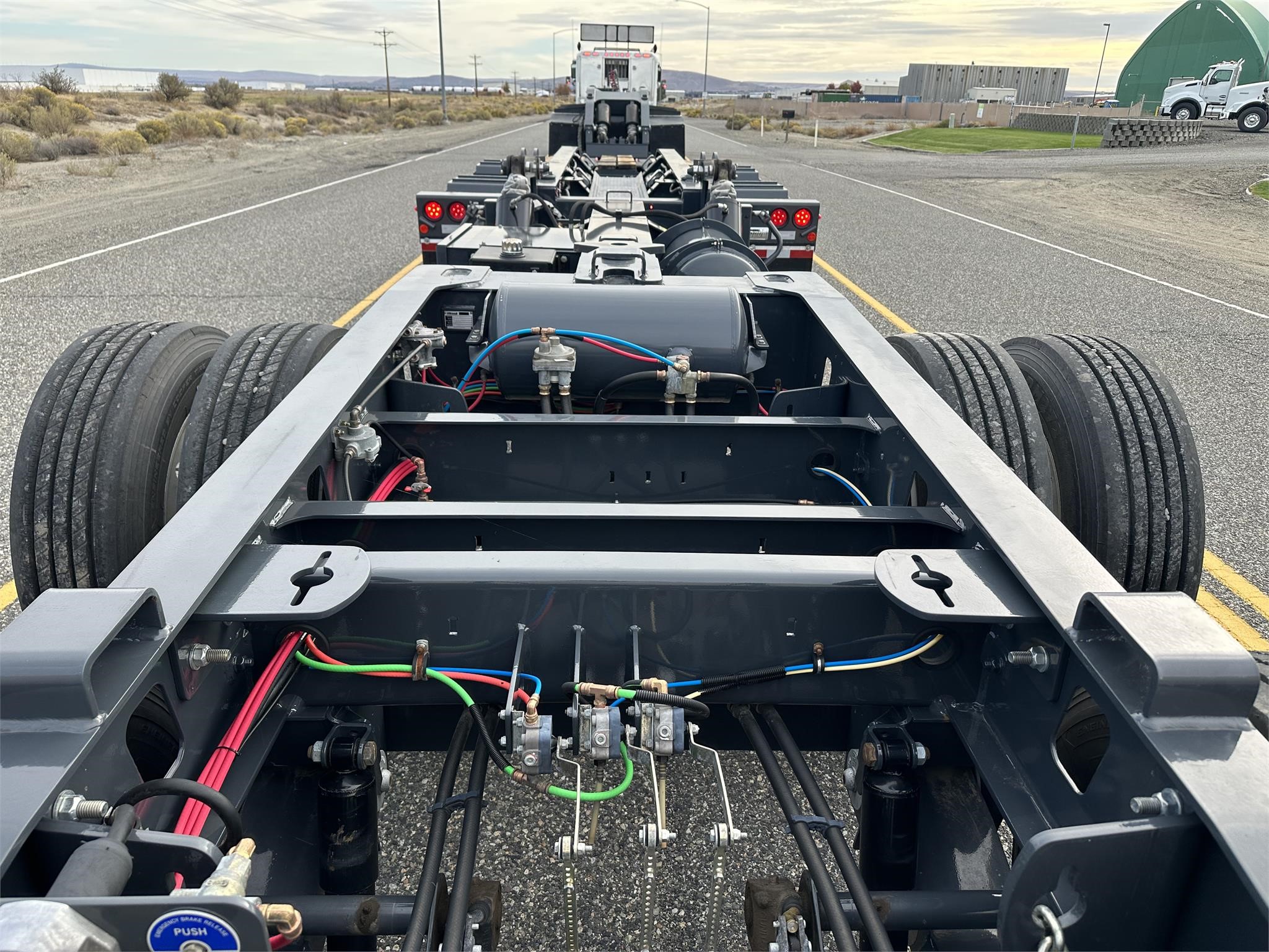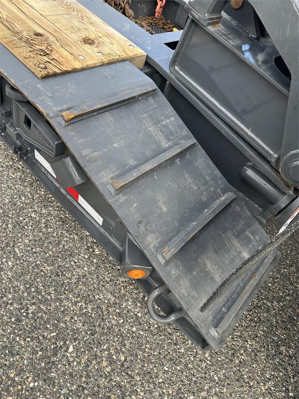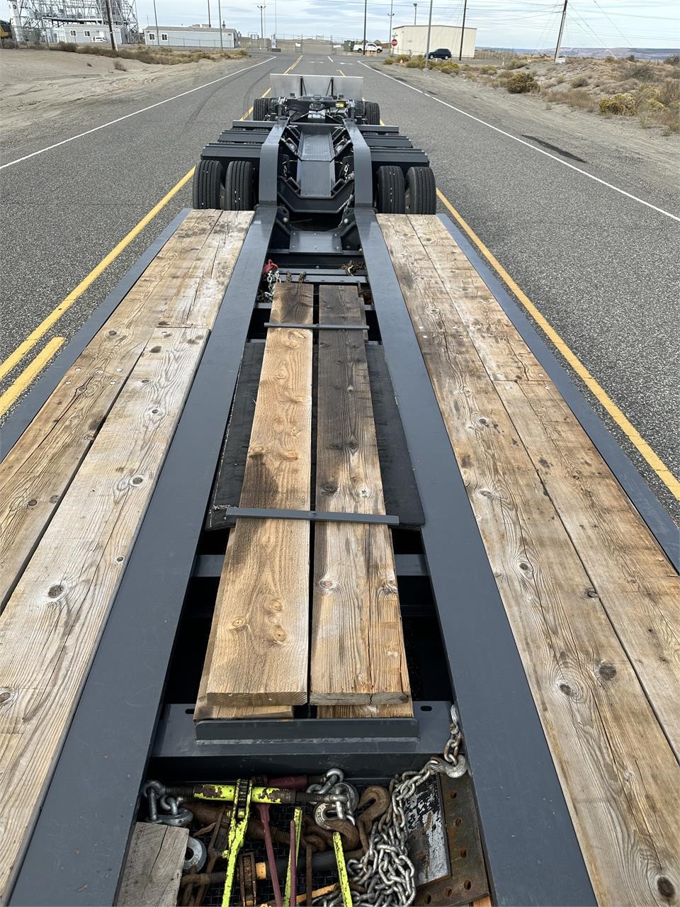 USED H650 65 ton RGN Lowboy, Flush Deck, 2+3+2 setup, 8’6″x24′ DRUM Brakes, Liftable 3rd Axle, – Gray